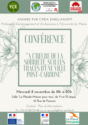 Pour notre avant-dernière action de notre programme associatif 2023 « Les écosystèmes », nous proposions en collaboration avec Yvré-Champagné Environnement, une conférence sur le thème « À l’heure de la sobriété sur les traces d’une ville post-carbone ».