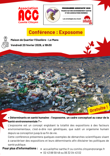 Dans le cadre de son programme associatif 2026 sur le thème : « Les stratégies du vivant », France Nature Environnement Sarthe organise, en partenariat avec l’association Comité Citoyen, une conférence sur l’exposome animée par Hervé CONRAUX :