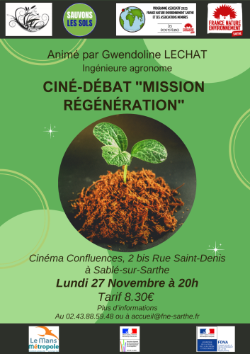 France Nature Environnement- Sarthe, le collectif environnemental Le Roseau72 et le collectif "Sauvons Les Sols" se sont associés pour organiser une projection tout public du film " Mission Régénération",
