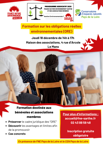 Dans le cadre de notre programme associatif 2025 sur le thème "Gestion environnementale ?". En partenariat avec FNE Pays de la Loire et le CEN Pays de la Loire (Conservatoire d’Espaces Naturels), nous vous invitons à une formation juridique sur le thème "Obligations Réelles Environnementales" (ORE).