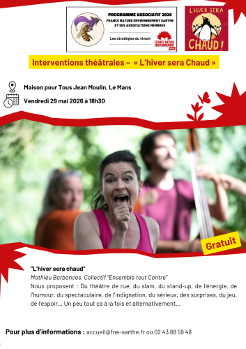Dans le cadre de son programme associatif 2026 sur le thème : « Les stratégies du vivant », France Nature Environnement Sarthe organise une intervention théâtrale sur le thème de l’environnement. Ce spectacle permettra de s’interroger sur nous, humains, quelles stratégies nous mettons en place pour notre environnement.