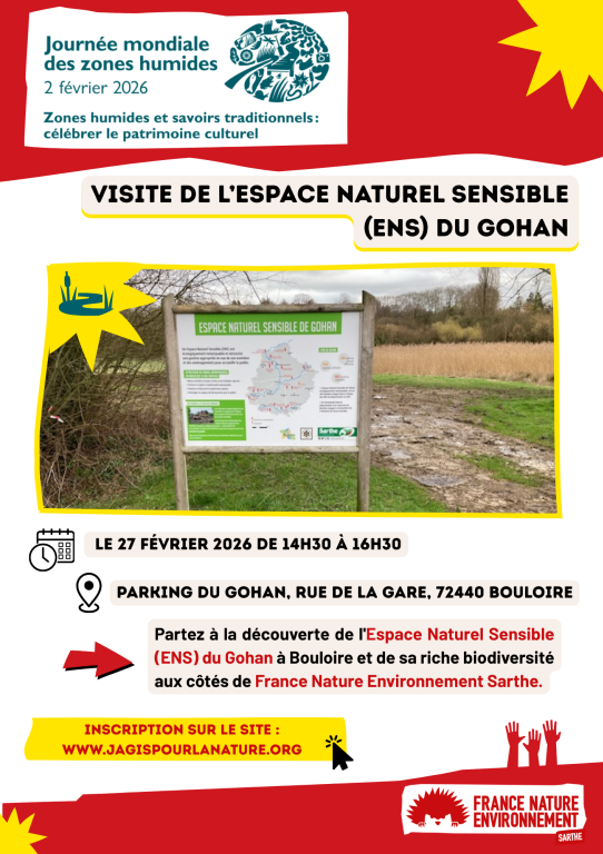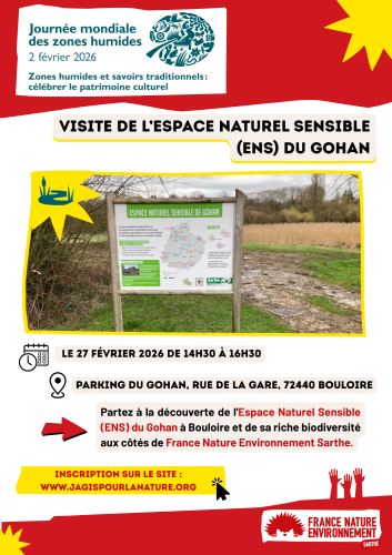 Avec France Nature Environnement Sarthe, partez à la découverte de l'Espace Naturel Sensible (ENS) du Gohan à Bouloire et de sa riche biodiversité aux côtés de France Nature Environnement Sarthe. Cet évènement est organisé avec France Nature Environnement Pays de la Loire. Noémie MOREL, chargée de mission eau et littoral de France Nature Environnement Pays de la Loire sera notre intervenante.