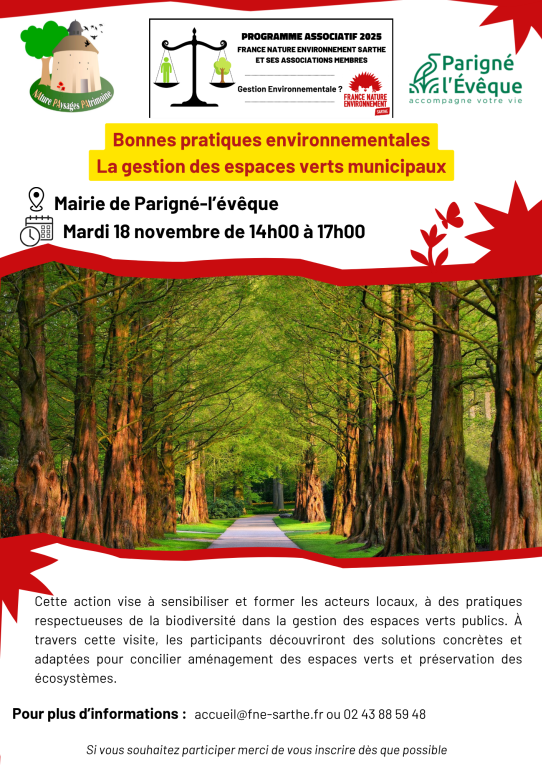 Cette visite gratuite, à destination du grand public, se déroulera à la mairie de Parigné-l'Évêque, le 18 novembre de 14h00 à 17h00, afin de mettre en avant et découvrir les principes d'une gestion plus durable des espaces verts et les aménagements en faveur de la biodiversité.